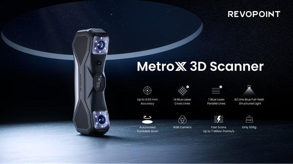 MetroX ist ein vielseitiger 3D-Scanner von Revopoint, der blaue Laser- und blaue Strukturlichttechnik kombiniert. Vier Scanmodi bieten die passenden Werkzeuge, um jeden Aspekt von kleinen bis mittelgroßen Objekten zu erfassen. Der Scanner erfasst sowohl detailreiche als auch detailarme Objekte mit einer Präzision bis 0,01mm, einer Genauigkeit von 0,03mm und einem verschmolzenen Punktabstand bis 0,05mm. Die Begleitsoftware Revo Scan verbessert den Scan- und Nachbearbeitungsworkflow und umfasst Punktwolkenfusion, Netzgenerierung, Bearbeitung sowie Import-/Exportoptionen. Außerdem wird eine Vielzahl von Dateiformaten unterstützt, sodass die Kompatibilität mit Software von Drittanbietern wie Quicksurface, Geomagic Wrap und Geomagic Control gewährleistet ist.