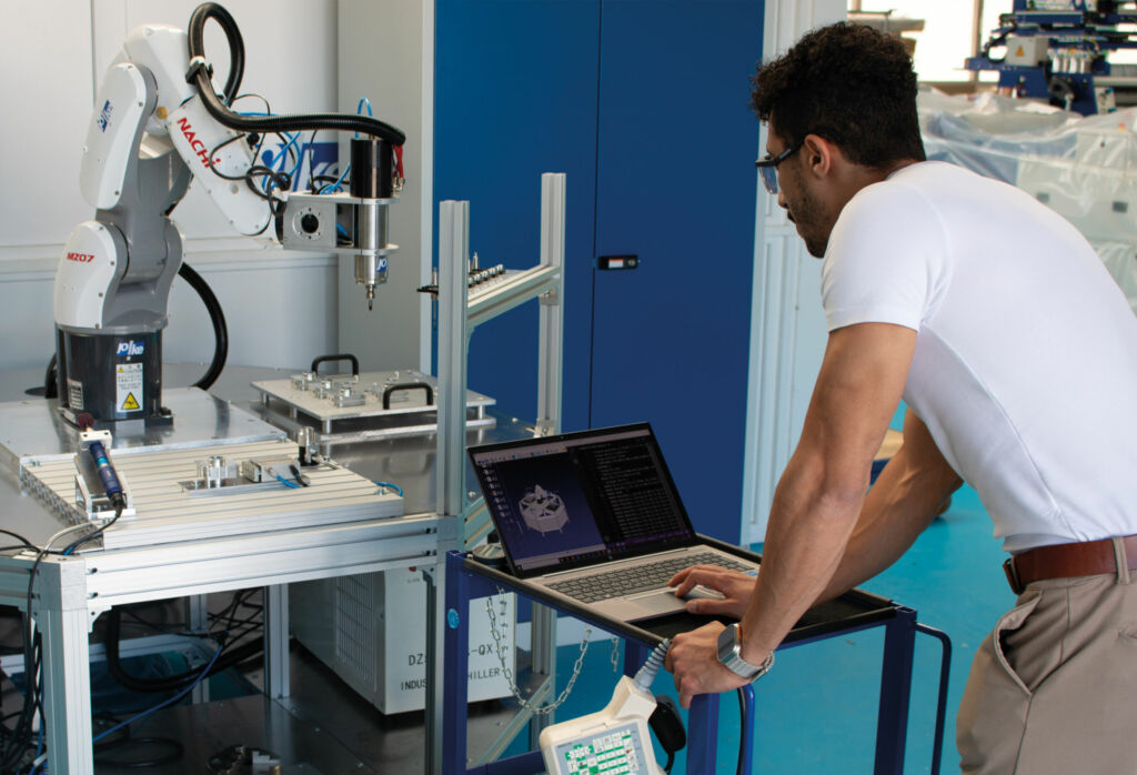 Die Oberflächenbearbeitung von Bauteilen durch Polieren, Entfernen von Kanten oder Schleifen ist zeitaufwändig und fehleranfällig. Um die komplexen Handgriffe schneller durchführen zu können, entwickelt die TH Köln gemeinsam mit Joke Technology eine Software zur Steuerung eines Roboters. Seine Bewegungen sollen die Handgriffe der Fachkräfte nachahmen. So können die Arbeitenden vor gesundheitlichen Risiken geschützt werden. Die maschinelle Unterstützung ist zudem ein Weg, um dem zunehmenden Fachkräftemangel zu begegnen. Im Forschungsprojekt iPro wird dafür eine grafische Programmierumgebung mit intuitiver Bedienoberfläche entwickelt, um die Nachbearbeitungsschritte zu vereinfachen. Dazu werden die Handbewegungen der Arbeitenden beim Polieren per optischer Sensorik aufgenommen. Des Weiteren werden wichtige Daten wie die Kräfte beim Andrücken der Werkzeuge und Umdrehungszahlen über Sensoren erfasst. Anhand dieser Daten wird am Versuchsstand die Arbeitsweise des Roboters programmiert. So lässt sich auch festlegen, wann ein Teil der Oberfläche ausreichend behandelt ist und der nächste Bearbeitungsschritt beginnen soll.
