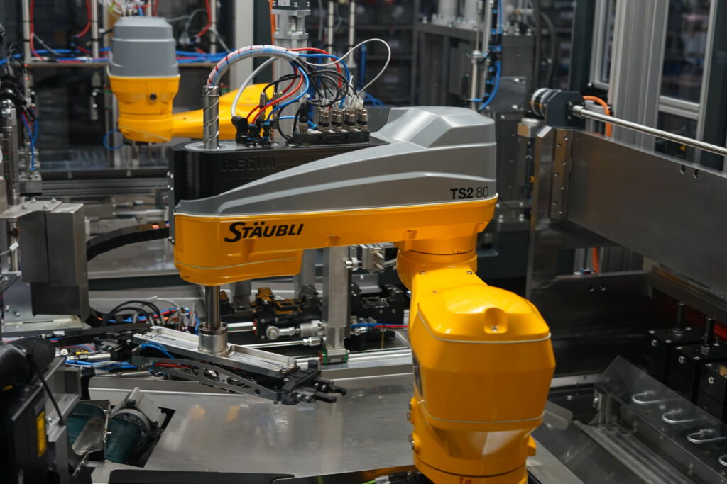 Für Argo-Hytos projektierte der Systemintegrator Resim eine voll automatisierte Anlage zur Produktion von elektromagnetischen Ventilen. Das Handling der Ventile übernehmen Scara-Roboter von Stäubli und lösen dabei auch anspruchsvolle Aufgaben wie das Ein- und Herausschrauben der Ventile in einer End-of-line-Teststation. Die Ventile werden, wenn sie in Betrieb sind, mit mehreren 100bar Druck beaufschlagt. Entsprechend genau muss die Montage der einzelnen Komponenten und insbesondere der Dichtungen sein. Als besondere Herausforderung stellte sich während der Projektierung die Automatisierung der End-of-line-Prüfung heraus. Für diese Aufgabe hat Argo-Hytos ein eigenes Prüfgerät entwickelt, und hier kam es zu einem unerwarteten Hindernis. Das Einschrauben der Ventile in die Teststation bereitete dem TS2-80 keine Probleme. Beim Herausschrauben hingegen verklemmte sich ab und zu der letzte Gewindegang der Ventile, was zum Stillstand der Testanlage führte. Die Resim-Konstrukteure konnten dieses Problem lösen, indem sie sich die Tatsache zunutze machten, dass die Stäubli-Roboter eine integrierte Kraftmessung – ohne externe Sensorik – an allen vier Achsen erlauben. In diesem Fall wird die Kraft an der vierten Achse gemessen. So kann die Steuerung der Anlage direkt erkennen, ob sich das Ventil leicht im Innengewinde der Testanlage drehen lässt. Steigt die gemessene Kraft an, kann die Verklemmung durch ein kurzes Reversieren der Drehbewegung gelöst werden. Bei Bedarf wird dieser Vorgang mehrfach wiederholt. Damit ist in jedem Fall sichergestellt, dass sich das Ventil nicht verklemmt und die Anlage nicht ungeplant zum Stillstand kommt. Diese Lösung bietet den Vorteil, dass die Kraftmessung integriert im Antriebssystem stattfindet. Man benötigt somit keine externe Sensorik.
