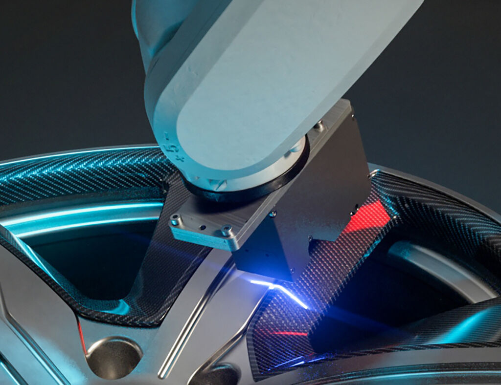 Eine Machbarkeitsstudie für ein Automobilunternehmen betraf die eindeutige Defekterkennung an vielen Messpunkten bezüglich der exakt positionierten Kunststoff-Blades in der Einpassung von Aluminiumfelgen mittels 3D-Bildscan. Es galt den messtechnisch erfassten Nachweis zu erbringen, dass alle Blades in der Autofelge ein vorgeschriebenes zulässiges Spaltmaß und den zulässigen Höhenunterschied zur Aluminiumoberfläche aufweisen. Neben einer aufwendigeren Inline-Lösung überzeugten die technologischen und wirtschaftlichen Vorteile einer autarken flexiblen Systemlösung mit der platzsparenden QBIC-Plattform innerhalb der industriellen Serienfertigung.
