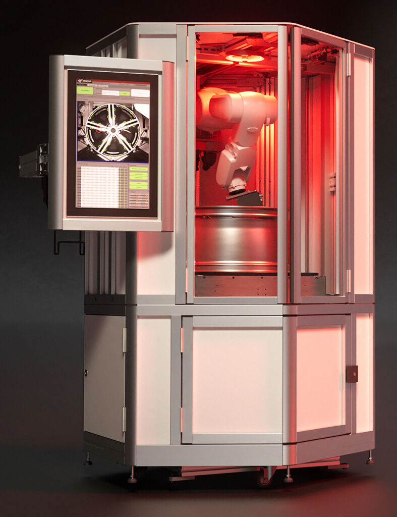 Jede Felge wird dabei manuell oder automatisiert im Schubfach des QBIC abgelegt und in die Messposition gefahren. Eine 20MP-Kamera erfasst mit einer Prüfgenauigkeit von 0,3 bis 0,15mm von oben die exakte Zentrierung der Felge, deren Rotationsposition und Radtyp. Damit ist auch der makellose Zustand der Autofelge dokumentiert. Der 3D-Kameramesskopf wird mittels Sechsachsroboter an die jeweiligen Prüfpositionen bewegt.