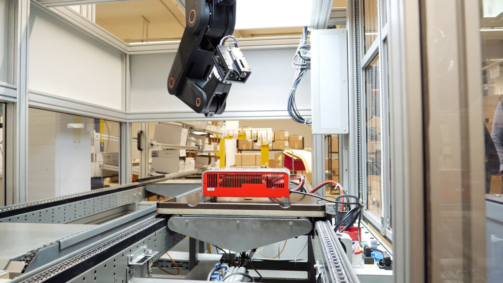 Der Robolink-Roboter von Igus übernimmt in der Fertigung von Benning den Prüfzyklus für die Belatron-Traktionsladegeräte und nutzt dabei verschiedene Prüfmittel. Der Lowcost-Roboter verfügt dafür über ein vielseitiges Werkzeug am Roboterarm. Neben einer Kamera zur Bilderkennung und einem Laserabstandsensor zur Vermessung des Geräts ist auch eine elektrisch leitende Prüfnadel für die Gehäusekontaktierung und zum Betätigen der Bedienelemente integriert. Im ersten Schritt identifiziert der Roboter das individuelle Ladegerät, indem er mit der Kamera den Barcode erfasst. Damit kennt er das Prüfprogramm. Anschließend vermisst er das Gerät mit dem Lasersensor und bewertet mithilfe der Kamera Gerätefarbe und -beschriftung.