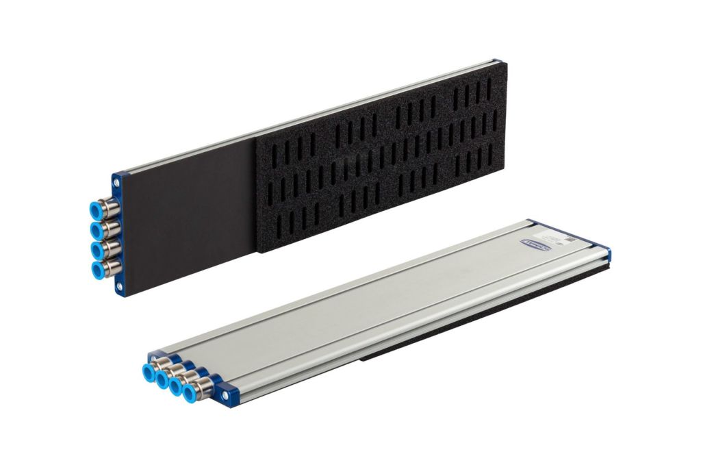 Schmalz hat einen neuen Greifer für die vertikale Handhabung von Bildschirmen entwickelt. Der FEL baut so flach, dass er auch bei anderen automatisierten Handhabungsaufgaben in beengten Platzverhältnissen oder mit kritischen Störkonturen eingesetzt werden kann. Das Grundprofil des neuen Flächengreifers misst 26,5mm Höhe inklusive Dichtschaum. Er ist in bis zu vier Zonen segmentiert, die einzeln angesteuert und abgeschaltet werden können. Um die Störkonturen möglichst gering zu halten, erfolgt die Versorgung der einzelnen Saugzonen durch Kanäle, die in das Profil integriert sind. Das Vakuum wird über externe Vakuumerzeuger aufgebaut.