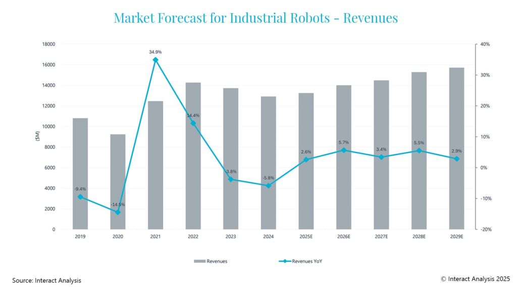 Der Einbruch in der globalen Industrieroboterbranche in 2023 setzte sich laut Interact Analysis auch in 2024 fort; mit einem Umsatzrückgang von 5,8% im Vergleich zum Vorjahr. Der jüngste Bericht des Marktforschungsunternehmens deutet darauf hin, dass das auf eine schleppende Nachfrage zurückzuführen sei, die durch einen Rückgang der Produktionstätigkeit im Laufe des Jahres in Verbindung mit einem Rückgang der Durchschnittspreise verursacht wurde. Die verarbeitende Industrie sah sich 2024 aufgrund der hohen Zinsen in den westlichen Märkten und der gedämpften Nachfrage in Asien mit einem schwierigen Jahr konfrontiert. So haben sich auch die Investitionen in die Produktion in allen wichtigen Regionen verlangsamt. Darüber hinaus hat der harte Wettbewerb auf dem Markt für Industrieroboter die Gewinnspannen der Roboterhersteller erheblich unter Druck gesetzt, und viele aufstrebende Marken haben ihre Rentabilität für Marktanteile geopfert.