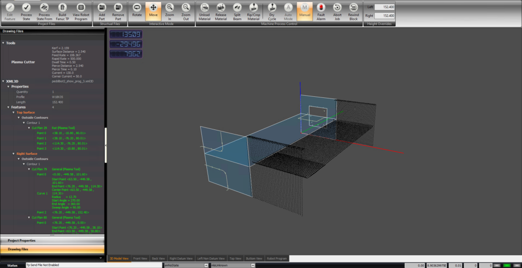 Mit PeddiBot hat Peddinghaus eine Produktfamilie, die mittels Plasmaschneider am Ende eines Roboterarms ein präzises Brennschneiden ermöglicht. Präzise bedeutet, dass der Abstand zwischen Plasmaschneider und Stahlprofil gleich bleiben muss, um ein einheitliches Schnittbild ohne Grat und damit ohne Nachbearbeitung zu erreichen. Die Daten zur Führung des Roboterarms werden anhand eines 3D-Vision-Systems berechnet. Hierbei wird das Stahlprofil am Vision-System vorbeigeführt, das einen auf das Stahl projizierten Laserstrahl kontinuierlich erfasst und die Daten an einen Vision-Server auf einem Industrie-PC sendet. Mittels Center of Gravity (COG) Algorithmus wird die Laserlinie im Bild bestimmt und eine Homographie-Matrix angewendet, um die 2D-Pixelkoordinaten in reale 3D-Messungen umzuwandeln. Auf dieser Basis werden die Koordinaten für die Schnittwege des Roboters ermittelt.