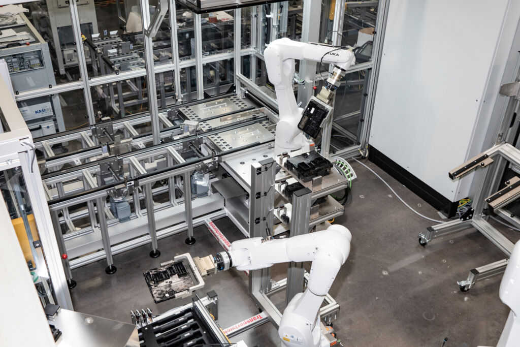 Vier der insgesamt sieben Roboter werden im Testbereich verwendet. Sie arbeiten nach dem Chaku-Chaku-Prinzip, ein aus dem Japanischen stammender Begriff für automatisierte Arbeitssysteme: In dem durchgehend automatisierten Produktionsprozess mit Linien und Maschinen sorgen die Roboter dafür, dass jedes Bauteil zum richtigen Zeitpunkt dort liegt, wo es benötigt wird. Alle Bewegungen wurden so aufeinander abgestimmt, dass der vorhandene Raum bestmöglich genutzt wird und die Taktzeiten kurz bleiben.