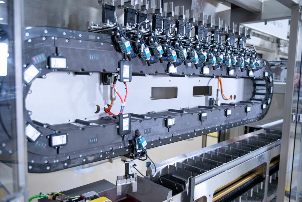 Die Firma Rotzinger PharmaPack benötigte für eine Multi-Carrier-Anlage zur Handhabung von einzelnen Kekspackungen ein Greifsystem, das den Anforderungen der Linearantriebe gerecht werden sollte. Mehrere Greifer sind hier hintereinander auf den Movern installiert und bewegen sich mit dem Umlaufband. Insbesondere die Verkabelung in solch einem Umlaufsystem stellt eine Herausforderung dar. Konventionelle Lösungen können hier schnell zu einer Störkontur im Prozessablauf werden, insbesondere wenn, wie in diesem Fall, eine Vielzahl von Endeffektoren zum Einsatz kommt.