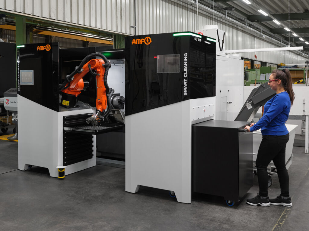 „Dass wir die ersten sind, die das neue AMF-Beladesystem Smart Automation einsetzen, ist eine nette Randnotiz. Viel entscheidender ist, was es uns an Unabhängigkeit bringt“, betont Wolfgang Stein, Standortleiter bei Güthle. Das flexible Robotersystem automatisiert das Werkstück-Handling von Kugelpfannen an einer Haas-Drehmaschine. Diese Kombination bildet die Basis, um wichtige Bauteile selbst herzustellen, anstatt sie wie vorher zuzukaufen. Bis zu 10.000 Stück der Metallpressteile werden jährlich in vier Varianten auf Maß gedreht. Beladen und entnommen werden die Werkstücke vom Roboter. Dazu wird die Türe zur Drehmaschine automatisch geöffnet und geschlossen, bevor die Werkstücke in der gegenüber positionierten Reinigungsanlage gesäubert werden.