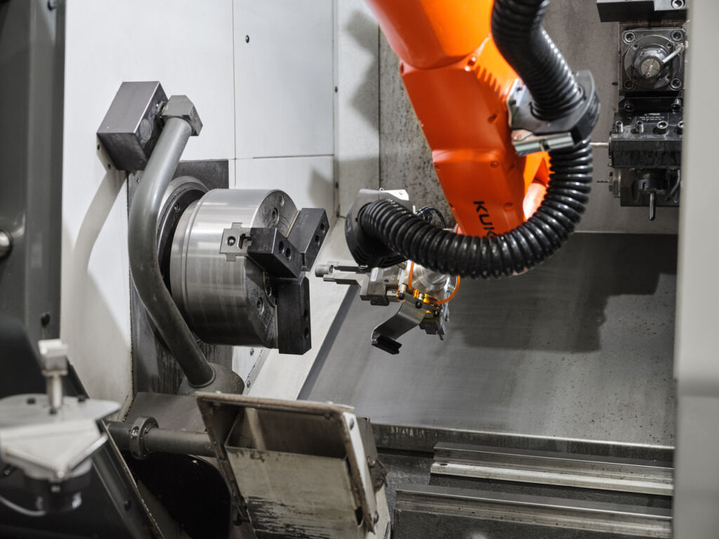 In zwei Aufspannungen werden die Kugelpfannen auf Endmaß gebracht. Am Handgelenk des Sechsachsers sitzt ein Doppelgreifer mit integrierter Ausblasung. Er kann durch unterschiedliche Geometrien in einem Zyklus ein fertig bearbeitetes Teil entnehmen und ein neues Rohteil einwechseln. Eine optionale Wendeeinheit würde die Bearbeitung von Teilen an allen Seiten ermöglichen. Das ist bei Güthle nicht möglich, da die zweite Aufspannung ein anderes Spannmittel zur Aufnahme erfordert. So wird zunächst bei allen Bauteilen die erste Drehoperation durchgeführt, bevor nach dem Wechsel der Aufnahme der zweite Schritt erledigt wird. Damit dies reibungslos und vollautomatisch gelingt, hat Güthle den Türöffner Smart Door von AMF installiert. Die Einheit ist kompatibel mit gängigen Maschinenausführungen, einfach nachrüst- und programmierbar und passt damit auch für die Haas-Drehmaschine. Die Mitarbeitenden in der Zerspanung sind nicht mehr so stark an diese Maschine gebunden und können sich anderen Projekten widmen.