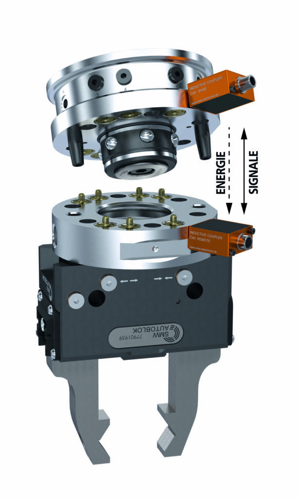 Ein weiteres Anwendungsgebiet ist die elektrische Übertragung mittels Anbaumodule an Robotergreifer-Schnellwechselsysteme. Beim Einwechseln eines Greifers wird die integrierte Sensorik des Greifers mit Energie versorgt und die Sensorsignale zur Prozessüberwachung zeitgleich übertragen. Das ermöglicht den Verzicht auf kontaktbehaftete, verschleißanfällige Steckverbindungen. Darüber hinaus sind herkömmliche Kontakt-Pins empfindlich gegenüber Querkräften und Schmutz. Das neu entwickelte kontaktlose induktive Koppelsystem C40 wurde speziell für Greiferwechselsysteme entwickelt und ist in Schutzklasse IP67 ausgeführt. Es ist mit allen im Markt befindlichen Greiferwechselsystemen kompatibel.