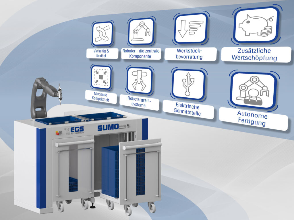 EGS Automation präsentiert im Rahmen der diesjährigen AMB erstmals den neuen Sumo Easyplex. Dabei handelt es sich um ein Handhabungssystem der Sumo-Standard-Automationssysteme, das das Be- und Entladen von Maschinen einfacher machen soll. Das System ist in der Lage, individuelle Werkstücke verschiedener Größen und Geometrien zu bevorraten. Dabei ist es mit einem Platzbedarf von 1,9m² besonders kompakt und ermöglicht durch sein mobiles Design auch ein einfaches Verschieben für die volle Zugänglichkeit zur Maschine. Eine weitere Besonderheit ist die einfache Inbetriebnahme und Bedienung im Do-it-Yourself-Verfahren. Das komfortable Bedienerpanel EGS Smart Pad ermöglicht eine intuitive Inbetriebnahme und Bedienung des Systems ohne eigene Programmierkenntnisse und bietet volle Kontrolle über alle für die Anlage relevanten Daten und Rezepte.