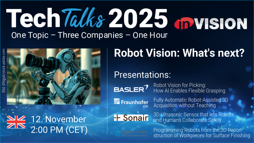 Am 12. November ab 14 Uhr (CET) findet das letzte Webinar der inVISION TechTalks 2025 statt. Das Thema lautet ‚Robot Vision – What’s next?‘ und die Präsentationen werden gehalten von Basler (Robot Vision for Picking: How AI Enables Flexible Grasping), IT+Robotics & Vision On Line (Vision system for the automatic generation of machining toolpaths), Fraunhofer IGD (Autonomous Robot-based 3-D Digitization – no teaching required) sowie Sonair (3D ultrasonic sensor that lets robots and humans collaborate safely). Zur kostenfreien Anmeldung für das englischsprachige Webinar geht es hier: openwebinarworld.com