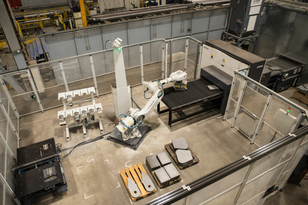 Die neue Entgratlinie Zuschnitt am Liebherr-Produktionsstandort in Biberach, die gemeinsam mit Arku Maschinenbau, Rösler Oberflächentechnik und Teqram entwickelt wurde, automatisiert die Kantenverrundung von plasma-, autogen- und lasergeschnittenen Blechen. Schlacke entfernen, Entzundern, Entgraten und Kanten verrunden: All diese Arbeitsschritte übernimmt die neue Anlage. Dadurch werden die Bleche mit einem Gewicht bis 200kg für die weiteren Produktionsschritte aufbereitet. Aus den Teilen entstehen u.a. Bauteile für Kranausleger und Turmstücke. Roboter ausgestattet mit Kameratechnik legen die maximal 1.250mm breiten und bis zu 100mm dicken Bleche auf und nehmen sie nach der Verarbeitung wieder ab.