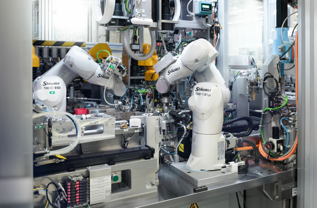 Zu den Kernprozessen der Fertigung im Bosch-Werk in Bamberg gehören auch die Produktion und Montage von Sensormodulen in kurzer Taktzeit. Die Montage dieser Module ist ein komplexer Prozess, der hohe Anforderungen an die Automation stellt. Auf engem Raum sind hier fünf Stäubli-Roboter und 18 Bildverarbeitungssysteme installiert, drei davon auf NC-Achsen, die ein Verfahren der Kameras ermöglichen. Die Bestückung der Montagenester des Rundschalttisches mit den entsprechenden Bauteilen übernehmen TX2-Sechsachsroboter, die hier nicht nur präzise, sondern auch dynamisch zu Werke gehen müssen, um die vorgegebenen Taktzeiten halten zu können. Die Bereitstellung der Teile erfolgt über automatische Zuführungen. Kameras übermitteln die exakten Greifpositionen an die Roboter. Auch das präzise Ablegen der winzigen Bauteile in den Nestern des Rundschalttisches erfolgt kameraüberwacht. Damit ist bereits die Vorbestückung des Rundtisches im Sinne einer Null-Fehler-Montage lückenlos überwacht und dokumentiert.