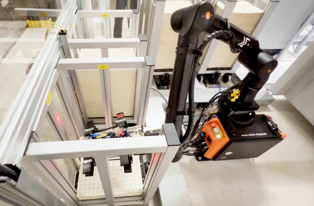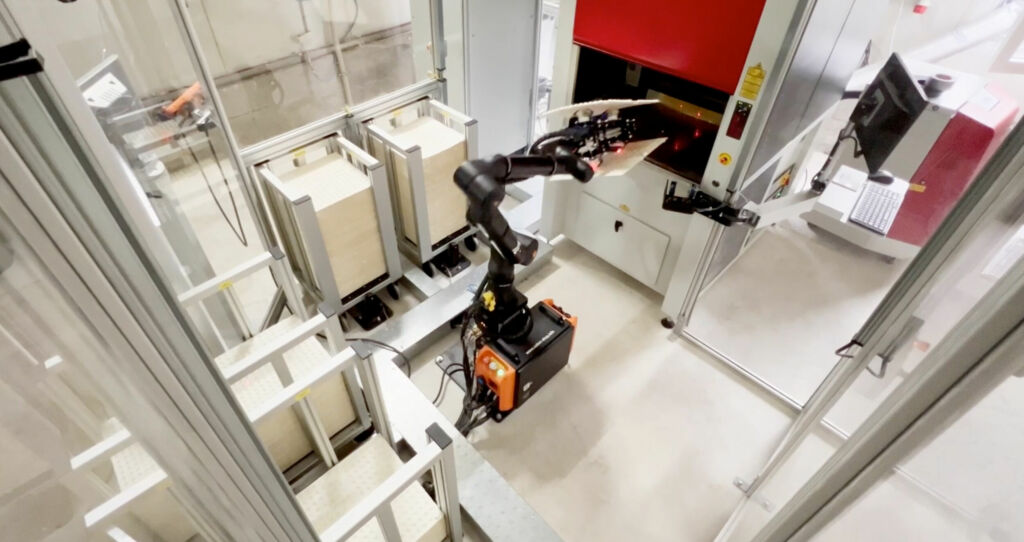 Während die meisten Cobots auf dem Markt über sechs Achsen verfügen, setzt der Hersteller Kassow Robots aus Kopenhagen bei seinen Modellen auf sieben Achsen. Die Fähigkeit, ums Eck greifen zu können, zahlt sich auch bei der Laseranlage von Biocare aus. „Die Erreichbarkeit ist mit dem Siebenachsroboter viel besser gegeben als mit einem Sechsachser“, erklärt Michael Becker. „Der KR1205 ermöglicht, dass wir die Gesamtanlage sehr kompakt bauen konnten. Denn wir sind mit den Behältern sehr nah am Roboter. Obwohl die Behälterwagen sehr tief sind, kann der Roboter die Pappen einfach herausnehmen – ohne die Geschwindigkeit zu reduzieren.“ Bei geringerem Tempo hätte man die Lösung auch ohne eine Umzäunung umgesetzt. Diese Option wurde aber von vornherein aufgrund des Ziels größtmöglicher Effizienz ausgeschlossen: Zum einen musste die Lasermaschine sowieso durch einen Schutzzaun abgesichert werden. Außerdem sollte der Laser schnellstmöglich bestückt werden. Durch einen Doppelgreifer kann der Roboter die Pappen extrem schnell wechseln und steht sofort mit der nächsten Pappe bereit. Neben dem Roboter, der die Lasermaschine bestückt, kommen bei Biocare weitere KR1205-Cobots zum Einsatz – etwa beim Verpacken der Schlupfwespeneier. Auch um die gelöcherten Pappen aus den Wagen zu nehmen und den zweiten Teil der Anlage bestücken, werden zwei Cobots eingesetzt.