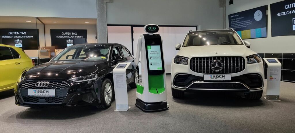 Die Serviceroboter von Pi4_Robotics kommen nun auch in Autohäusern zum Einsatz. Der Roboter empfängt und berät die Kunden, dabei bietet er auch Getränke und Snacks an. Auf dem großen Touchdisplay kann er technische Informationen, Ausstattungsmerkmale und Detailpreise visualisieren. Durch die integrierte Kassenfunktion, kann der Roboter auch bargeldlos Autos oder Zubehör verkaufen. Der Monteur kann per Smartphone oder PC den Roboter außerdem beauftragen, die passenden Ersatzteile oder Werkzeuge aus dem Lager zu holen. Der Roboter bewacht das Autohaus auch mit Patrouillengängen. Mitarbeiter werden mit Gesichtserkennung identifiziert. Unbefugte Eindringlinge oder Feuer werden gemeldet. Wachzentralen oder die Autohausbesitzer können sich auf den Roboter aufschalten und durch Telepräsenz sehen, hören, aber auch Personen ansprechen. Der Roboter verfügt über eine eigene 5G-Internetverbindung. Die Steuerung erfolgt mit jedem gängigen Webbrowser, damit ist das System sowohl vom PC als auch Smartphone aus, ohne App oder spezielle Software, steuerbar. Der DSGVO konforme Cloudserver wird in Berlin betrieben.