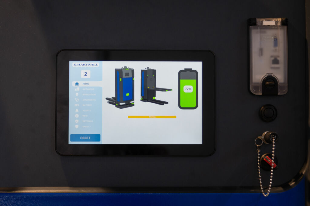 Um den neuen Softwareentwicklungen gerecht zu werden, setzt K.Hartwall die intuitive Benutzerführung auch bei seinen A-Mate-Fahrzeugen fort, die jetzt über ein größeres, interaktives Display verfügen. „Mensch und Maschine interagieren auf dem Shopfloor der Zukunft immer mehr miteinander. Daher ist es für einen nachhaltigen Projekterfolg zwingend notwendig, dass diese Interaktion über eine möglichst einfache und übersichtliche Benutzeroberfläche realisiert wird. Nur so kann die Akzeptanz für FTS gefördert werden“, erklärt Knopp die Neuerung.