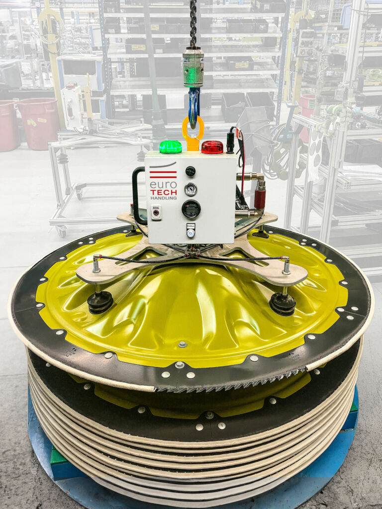 Um die Handhabung von großen oder scharfkantigen Teilen sicherer und ergonomischer zu gestalten, setzt der Landmaschinenhersteller Claas Vakuumhebetechnik von EuroTech ein. Dafür wurden die Hebegeräte individuell an die Anwendung angepasst. Zum Einsatz kommt das Vakuumhebegerät eT-Hover-Modesty. Das Gerät ermöglicht sowohl horizontales als auch vertikales Handling und kann manuell oder pneumatisch gedreht werden. Der Betrieb erfolgt komplett mit Druckluft. Mit einer Tragfähigkeit bis 250kg verfügt das Gerät über genügend Reserven. Das Hebegerät ist bei Claas an einem Deckenkran befestigt. Es nimmt die gewölbten Rundbleche horizontal von einem Lagerbock auf und transportiert sie zu einem Arbeitstisch für die Messermontage. Zuerst werden die losen Scheiben ohne Messer auf die Vorrichtung gehoben, dann folgen die Messer zur Befestigung. Schließlich wird die gesamte Baugruppe mit dem gleichen Gerät auf ein Transportgestell gesetzt, um sie dann, wieder mit Hilfe des Vakuumhebegerätes, an die Maschine zu montieren. Die Bedienung aller Einheiten erfolgt mit einem ergonomisch gestalteten Steuergerät, das intuitiv zu handhaben ist.