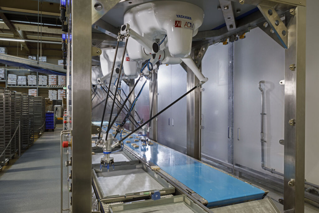 Die Backstube Malzers wird seit Kurzem durch sechs Motoman-Industrieroboter von Yaskawa unterstützt. Bei der Umrüstung auf einen automatisierten Prozess ging es um eine Produktionslinie, die automatisiert Backbleche und Dielen mit gefrorenen Brötchenteiglingen beschickt. Bei der vom Integrator ADM vorgeschlagenen Lösung übernehmen Roboter gleich drei Arbeitsschritte – das Depalettieren, das Einlegen des Backpapiers und die Belegung der Dielen bzw. Bleche mit den Teiglingen. Nachdem ein Mitarbeiter die Wagen mit Blechen oder Dielen zur Zelle geführt hat, legt sie der Sechsachs-Handling-Roboter Motoman GP180-120 von Yaskawa auf das Transportband. Ist die eine Seite depalettiert, fährt ein Schutzzaun hoch, und der Roboter wendet sich den Wagen auf der anderen Seite zu. Ein Mitarbeiter kann die leeren Wagen wegbringen und durch volle ersetzen. Pro Stunde nimmt der Roboter 400 Bleche bzw. 1.000 Dielen (zwei pro Zyklus) einzeln auf und legt sie auf das Band, wobei die Bleche angesaugt und die Dielen angeklemmt werden.