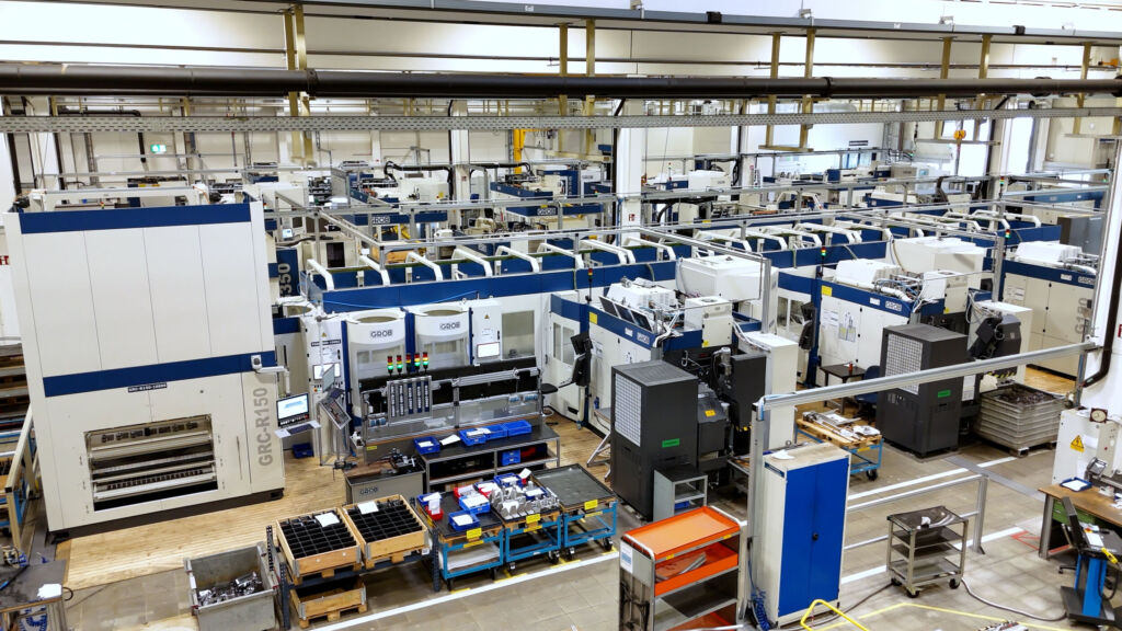 Grob wollte in der eigenen Fertigungshalle eine Produktion zu schaffen, die unterschiedliche Werkstücke gleichermaßen wirtschaftlich und flexibel fertigen kann. Statt auf externe Standardlösungen zu setzen, entschied sich das Unternehmen für eine konsequent eigene Herangehensweise – mit Lösungen aus dem eigenen Haus. Die Kombination aus Paletten- und Roboterautomation wurde bewusst gewählt, um hohe Autonomiezeiten mit größtmöglicher Flexibilität zu verbinden, ohne die Abläufe durch starre Standards einzuschränken. Das Palettenlinearspeichersystem PSS-L450 übernimmt das Paletten-Handling, die Roboterzelle GRC-R150 kümmert sich um das Teile-Handling und drei Universalmaschinen des Typs G150 wurden im Rahmen eines Mastermaschinenkonzepts mit speziellen Spannvorrichtungen integriert. Komplexe Spannvorrichtungen werden manuell über das PSS-L450 gespannt, während kleinere und größere kubische Bauteile von der Roboterzelle automatisch gehandhabt werden. Eine zusätzliche Schraub- und Prägestation innerhalb der Roboterzelle automatisiert weitere Arbeitsschritte und sorgt für noch mehr Effizienz.