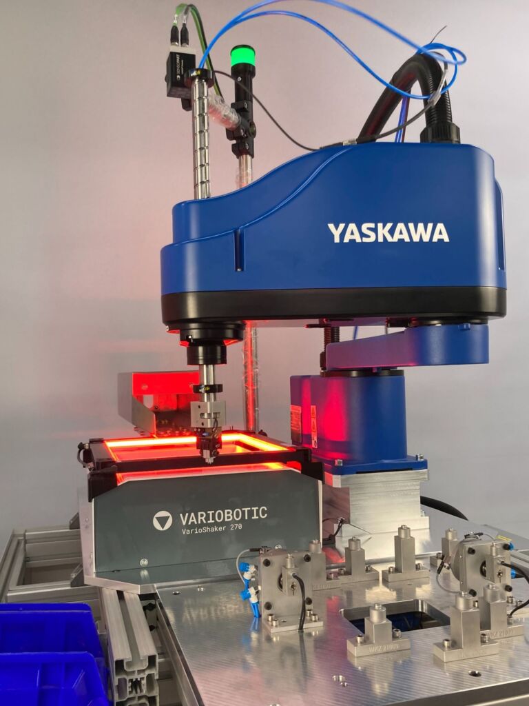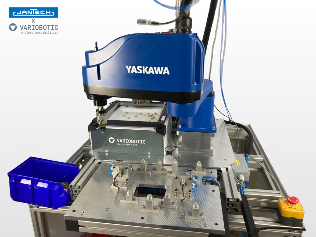 Bei der für Jantsch realisierten VarioFeed-Zelle wird diese Philosophie Realität. Die als Schüttgut zugeführten Inserts werden zunächst vom Herzstück der Zelle, dem VarioShaker 270, schonend und zuverlässig vereinzelt. Durch den gezielten Einsatz von Auflicht wird dabei eine optimale Erkennung der komplexen Teilestruktur sichergestellt. Ein Kamerasystem des Typs Visor Robotic V50 von SensoPart erfasst anschließend die exakte Position und Lage der vereinzelten Bauteile und übermittelt die Koordinaten in Echtzeit an den Roboter. Daraufhin greift ein Yaskawa Scara-Roboter SG650 die Inserts und setzt sie mit hoher Geschwindigkeit und Wiederholgenauigkeit auf die Dorne des Übergabenests. Gesteuert und synchronisiert wird dieses präzise Zusammenspiel von der Soft-SPS mit ihrem Betriebssystem Variobotic OS, das als Gehirn der Anlage fungiert. Es integriert alle Komponenten unter einer einzigen, intuitiven und webbasierten Benutzeroberfläche, was nicht nur die Inbetriebnahme, sondern auch die Bedienung und Umrüstung im laufenden Betrieb erheblich vereinfacht.