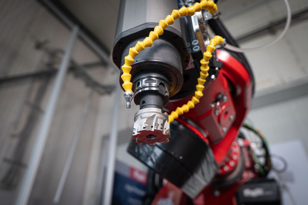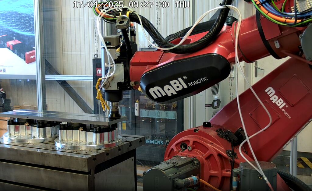 In der firmeninternen Versuchszelle wurde die industrielle Einsatzfähigkeit bei der Zerspanung von Stahl praxisnah geprüft. Beim Planfräsen einer Stahlplatte aus dem Werkstoff 1.0577 mit einem 80-Wendeplattenfräser konnte bei einer Spindeldrehzahl von 1.354U/min und 1.488mm Vorschub (Zustellbreite 52mm, Zustelltiefe 2mm) ein Zeitspanvolumen von 154,8cm³ pro Minute erreicht werden. Die Vermessung ergab eine Parallelität von 0,16mm sowie eine Oberflächengüte von Ra=0,8µm. Laut Hersteller ein neuer Benchmark für Präzision und Produktivität in der roboterbasierten Zerspanung.