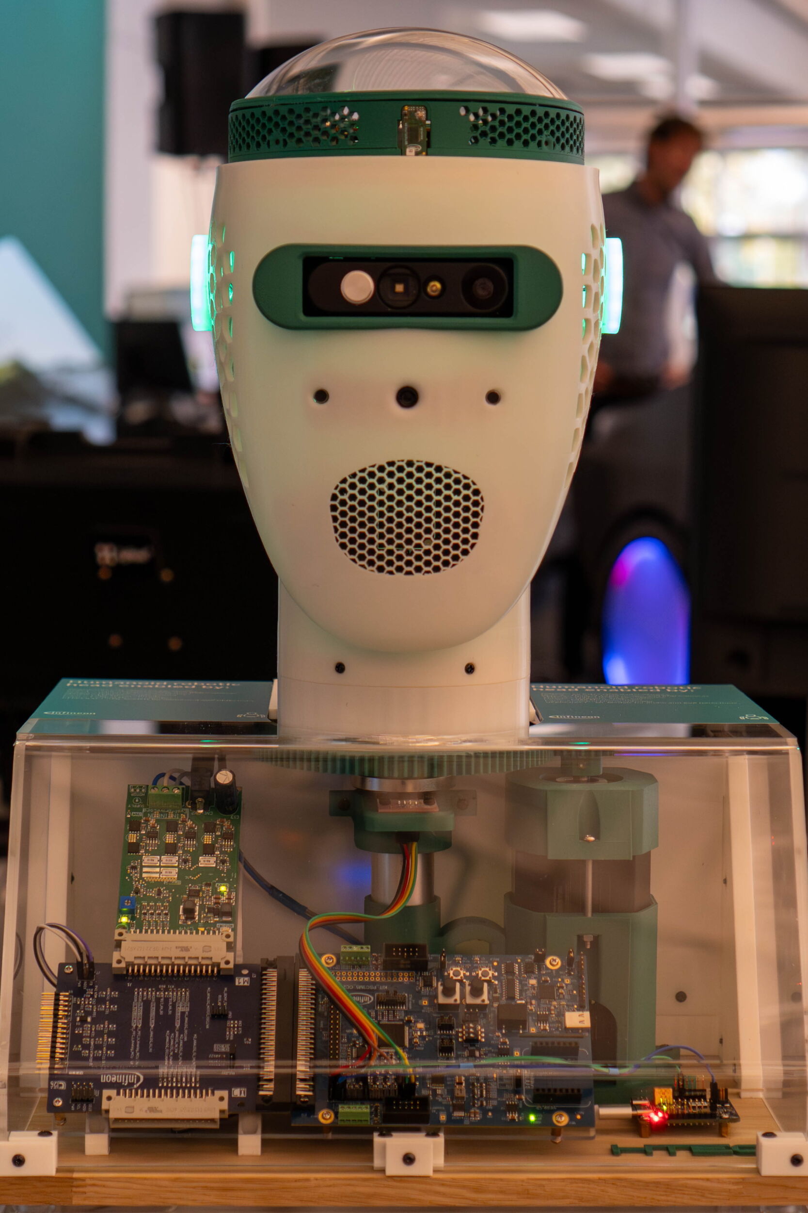 Die Realisierung humanoider Anwendungen erfordert eine Vielzahl unterschiedlicher Komponenten und ein hohes Integrations-Knowhow. Der von Infineon Technologies und HTec entwickelte Prototyp eines humanoiden Roboterkopfs ist dafür ein gutes Beispiel. Der Kopf zeigt, wie unter Nutzung vorhandener Mikrocontroller, Radarsensoren, Mikrofone oder Softwareanwendungen und mit der Entwicklung neuer Logikschichten die Integration in humanoide Systeme erfolgen kann.