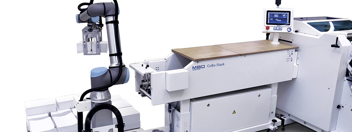 Hubsäule, Cobot und das Zuliefersystem des CoBo-Stack müssen miteinander kommunizieren. Die Fahrbefehle für die Säule werden über eine externe Steuereinheit an die Bedieneinheit weitergegeben. Die Motorsteuereinheit TR-EM-208 ist für den Betrieb mit einem einzelnen Stellantrieb ausgelegt. Neben der Hauptfunktion gibt es die Möglichkeit, ein softes Anfahren der Säule auszuführen und die Hubsäule bei Überlast zu stoppen. Wichtig war für MBO die einfache Bedienung und Konfiguration des CoBo-Stack. Auf einem Touchpanel gibt der Bediener neben der Palettengröße auch das Papierformat und die gewünschte Ablagenhöhe ein. Unterschiedliche Ablagemuster lassen sich einfach auswählen. Der Bediener der Maschine kann sich dann um andere Aufgabe kümmern, während der CoBo-Stack die Papierstapel aus einer Falzmaschine oder einer anderen Maschine aufnimmt und auf einer oder zwei Paletten absetzt. Der Greifarm wiegt beim ersten Aufnehmen den Stapel und eine Kamera erkennt die freien Positionen und gibt diese an die Steuerung weiter. Da der CoBo-Stack auf Rollen steht, lässt er sich in der Druckerei schnell bewegen und an eine andere Maschine ansetzen. Ein zusätzliches Absichern durch einen Schutzkäfig ist nicht notwendig.