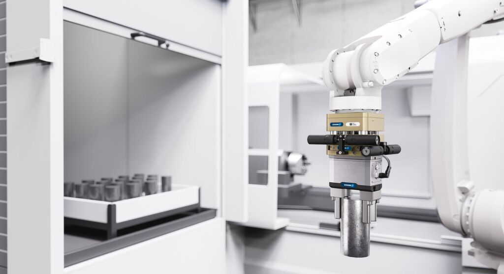 Beim Be- und Entladen von Maschinen sorgt die AGM durch ihren Ausgleich in X-, Y- und Z-Richtung für hochgenaues Positionieren, weniger Unterbrechungen und gesteigerte Prozessstabilität. – Bild: Schunk SE & Co. KG