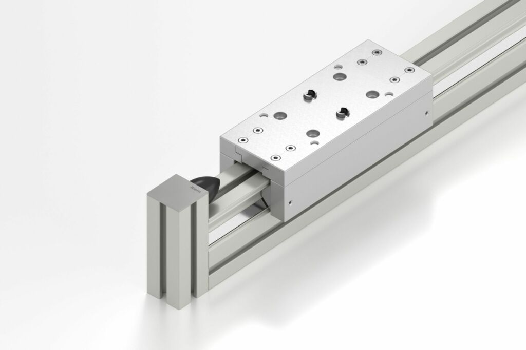 Neu im Portfolio von Item ist der Range Extender, der kollaborierende Roboter mit einer Lineareinheit verbindet und damit ihren Arbeitsbereich horizontal erweitert. Die Konstruktion besteht aus einem standfesten Untergestell, das sich in der Höhe anpassen lässt, und einer Lineareinheit KRF, kombiniert mit der neuen Linearführung KRF. Mithilfe einer Adapterplatte lassen sich unterschiedliche Cobot-Modelle sicher auf dem Schlitten befestigen. Die Kombination aus Cobot und Lineareinheit ermöglicht das Handling von Bauteilen innerhalb eines größeren Bereiches. Der Roboter bewegt sich entlang der 7. Achse und erweitert damit seinen Bewegungsradius. Dabei ist die Linearführung KRF 8 80×40 für große Lasten ausgelegt. So besitzt das verwindungssteife Führungsprofil aus Aluminium hochfeste Stahlbahnen. Der Schlitten wird selbst bei hohen Geschwindigkeiten und damit großer Momentenlast sicher geführt. Die beiden Linearachsen mit Kreuzrollenführung erzeugen gemeinsam eine dynamische Arbeitsumgebung für Cobots mit einer Geschwindigkeit bis 10m/s. Der maximale Hub beträgt 5.760mm und die Wiederholgenauigkeit liegt bei 0,1mm. Der Range Extender ist als konfigurierbare Musterlösung im Online-Shop verfügbar und lässt sich schnell und einfach anpassen.
