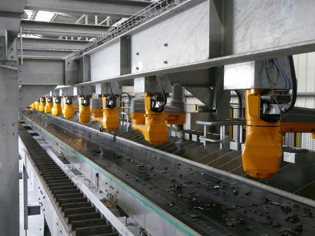 Auf dem Gelände einer Autorecyclinganlage von Comet Traitement sortieren 18 Scara-Roboter von Stäubli die wertvollen Metallanteile aus dem Schredder – 15.000 Tonnen pro Jahr. Ziel der Anlage ist es, Materialien wie Aluminium, Zink, Kupfer, Messing oder Edelstahl in Europa wieder in den Kreislauf zurückführen. Das Sortiersystem wurde gemeinsam von Forschern von der Universität Liège und dem Unternehmen Cilyx entwickelt. Entlang eines 50m langen zentralen Gurtförderer stehen die 18 Scaras vom Typ TS2-100. Mit einer Geschwindigkeit von 1m/s werden die zwischen 20g und 1kg schweren und zwischen 20 und 100mm langen zu sortierenden Teile transportiert. Verschiedene Sensorlösungen sorgen für die Detektion: Röntgenstrahlung (XRT) für die Erfassung der Materialdichte, 3D-Erfassung der Form und des Schwerpunktes bei jedem geschredderten Objekt, ein Libis-Lasersystem und hyperspektrale Farbsensoren, die das Reflexionsspektrum erfassen. Die Detektions-Sensorik arbeitet KI-unterstützt. Objekte, die nicht detektiert wurden, kommen ein zweites Mal in Umlauf und füttern die Steuerung mit neuen Daten. Aktuell erreicht das System laut Anbieter eine Detektions- und Sortierrate von 96 Prozent.