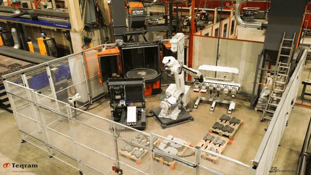 Am Standort Wolfurt des Seilbahnherstellers Doppelmayr werden jährlich über 15.000t Blechzuschnitte hergestellt. Bisher erfolgte das Verputzen dieser Teile von Hand, bevor sie in der Drahtgurtanlage gestrahlt wurden. Mit dem EasyGrinder von Teqram geschieht dieser Prozess nun für Bauteile bis 1.200x800mm und 200kg vollautomatisiert. Der EasyGrinder erkennt automatisch die Geometrie der Bauteile und wählt selbstständig die passenden Parameter auf Basis des Bearbeitungsrezeptes. Je nach Anforderung entfernt er Schlacke, bricht Kanten oder verrundet sie. Zudem beseitigt er Anschnittfahnen, senkt Bohrungen und schleift bei Bedarf die Schmalseiten zur Entfernung der Aufhärtung. Abschließend sorgt der Roboter für das effiziente Bestücken der Rundtischstrahlanlage in der die Werkstücke eine einheitliche saubere Oberfläche bekommen. Nach der finalen Behandlung werden die Teile vom Roboter wieder auf die Paletten gestapelt. Um die Kapazität möglichst gut zu nutzen, werden Bauteile in größerer Stückzahl bis zum Abend zurückgehalten, sodass der Roboter möglichst lange durch die Nachtschicht mit Material versorgt ist. Tagsüber liegt der Fokus auf den kleineren Losen.